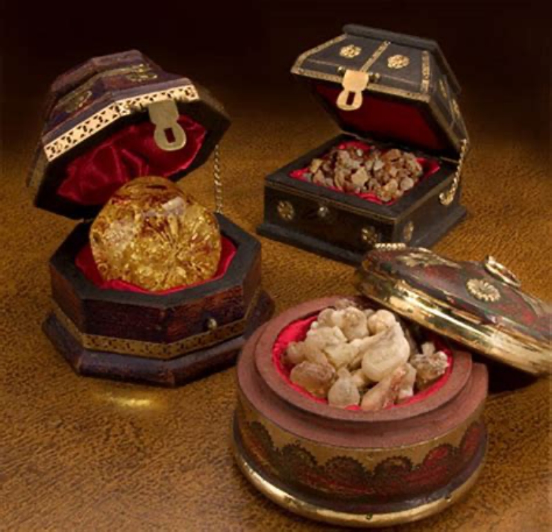 One source says of the frankincense, “Frankincense is a white resin or gum. It is obtained from a tree by making incisions in the bark and allowing the gum to flow out. It is highly fragrant when burned and was therefore used in worship, where it was burned as a pleasant offering to God (Exodus 30:34).”