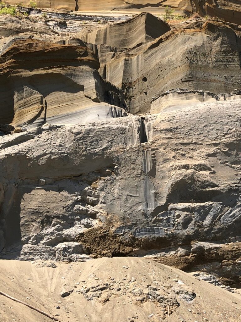 These sandstone cliffs have stood seemingly forever, yet they are slowly vanishing. If you look at the center of the pic, you can see a groove running downwards. The sand is almost constantly in motion, trickling back down to the sea as it slowly erodes away.